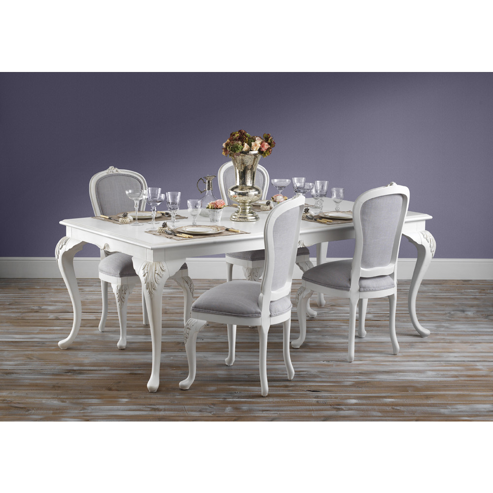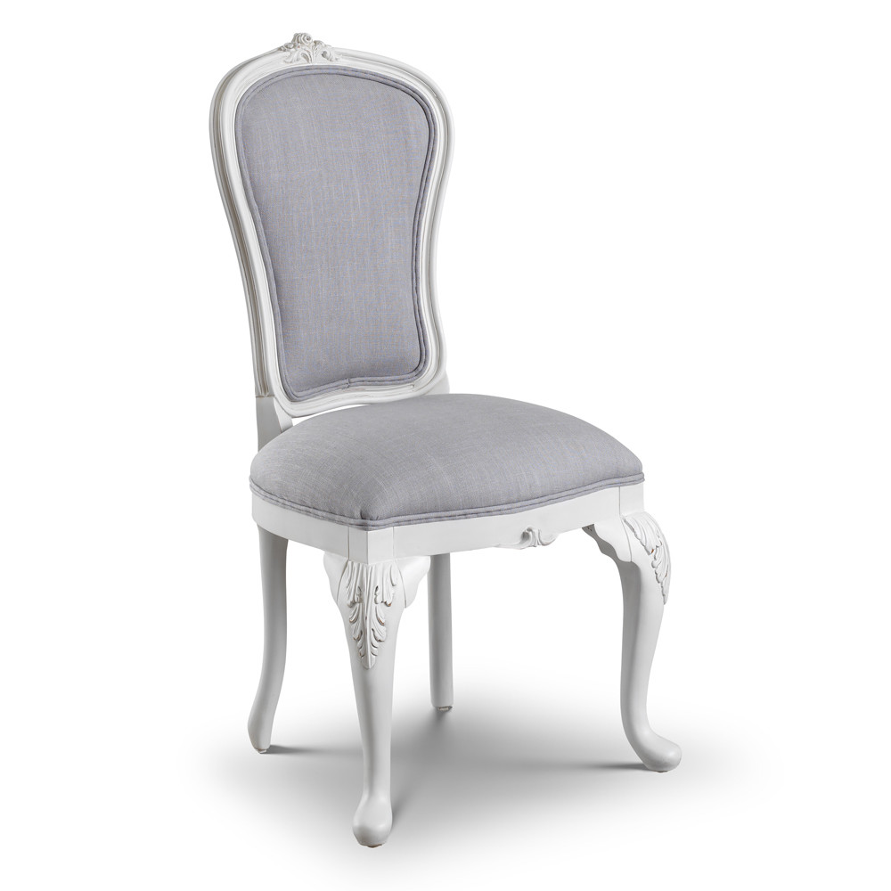 This elegant upholstered dining chair brings classic French charm to any dining space. Crafted from solid beech wood, it features an antique white painted finish with gentle distressing for a subtly aged look.